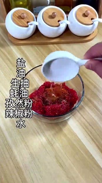 放入碗里,加入盐、油、生抽、蚝油、孜然粉、辣椒粉、水。