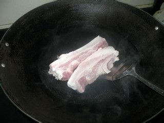 把买回来的五花肉,切成大块,放入冷水锅中煮熟。切记一定要冷水下锅。煮熟之后切成薄片备用