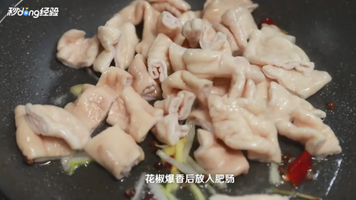 锅中放油,放入葱丝、姜丝、辣椒、花椒爆香后放入肥肠。