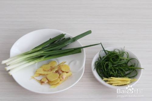 葱白切段,葱叶切丝,生姜一半切片一半切丝。