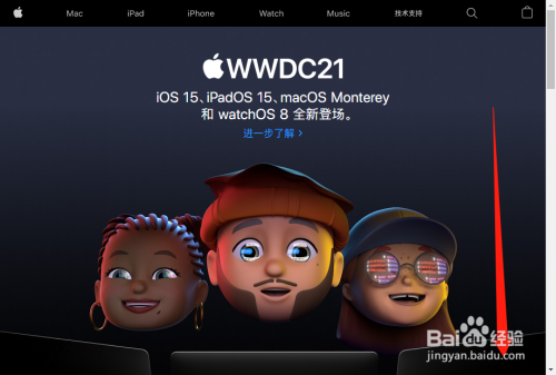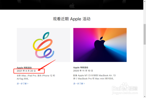 使用电脑打开浏览器,搜索并进入苹果官网,将页面拉到最下方点击活动。