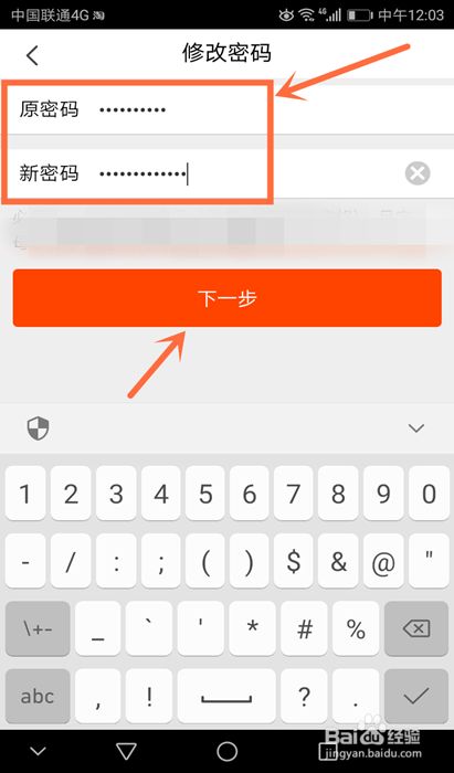 5.第五步,在上方输入“原密码”和“新密码”,再点击下方的“下一步”按钮;
