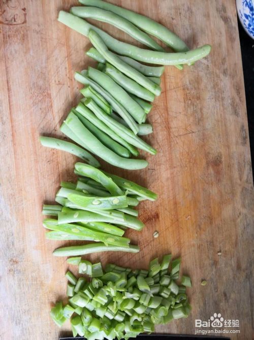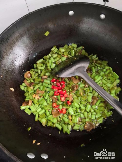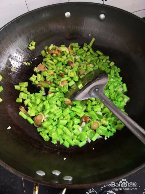 接着放入切沫的豆角,不断的翻炒一分钟。