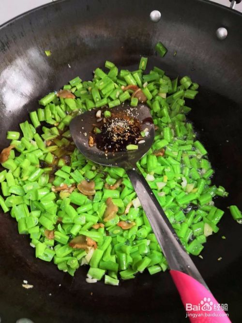 豆角的颜色变了之后,也就是刚刚半熟的样子,放入少量耗油,少量酱油,适量鸡精一起翻炒均匀。