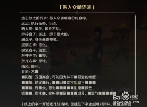 让我们去找三个间谍并给出了暗语表【找间谍的时候要用到】。