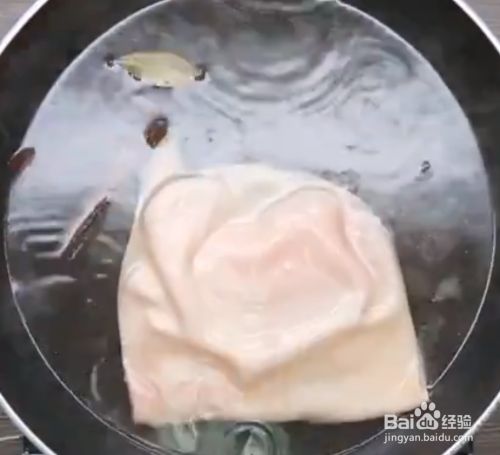 锅中放入2片姜,2片香叶和2个桂皮,将猪皮清洗后放入锅中焯5分钟