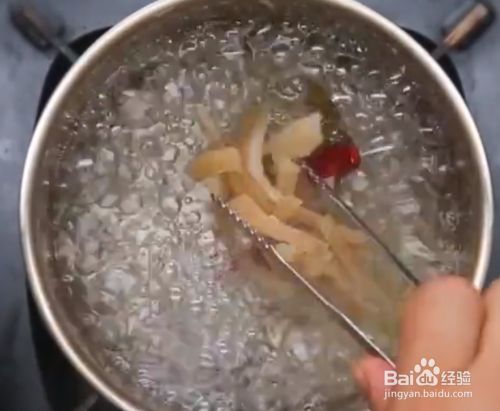 锅中再烧开水,将姜片,香叶,桂皮,红辣椒,盐,酱油和料酒放入锅中,将切好的猪皮放入锅中熬煮2个小时