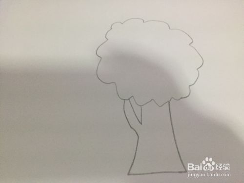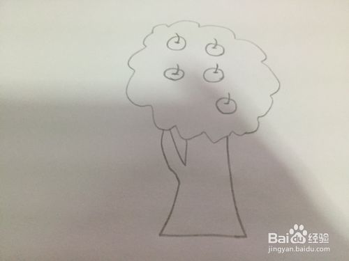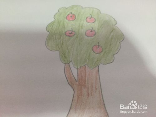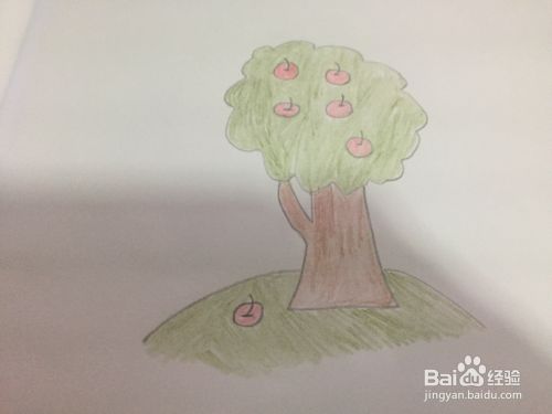 最后在苹果树下画一个苹果和一块草地,如图。这样苹果树就绘画好了。