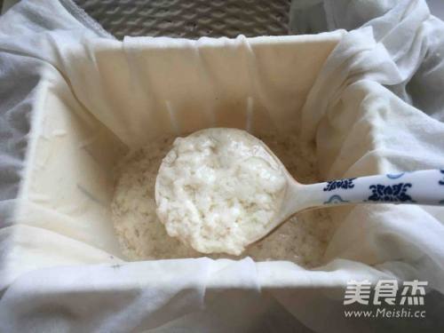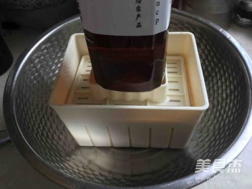 8找个盆,把模具放在盆里,铺上纱布,把豆花舀入