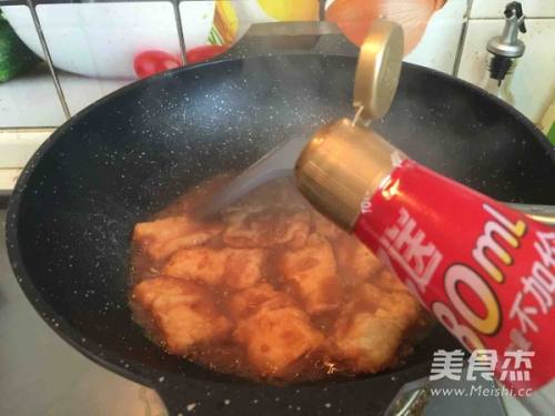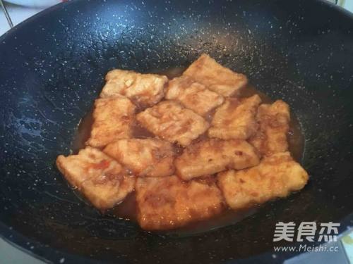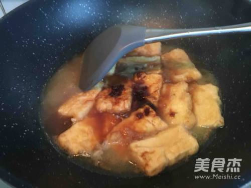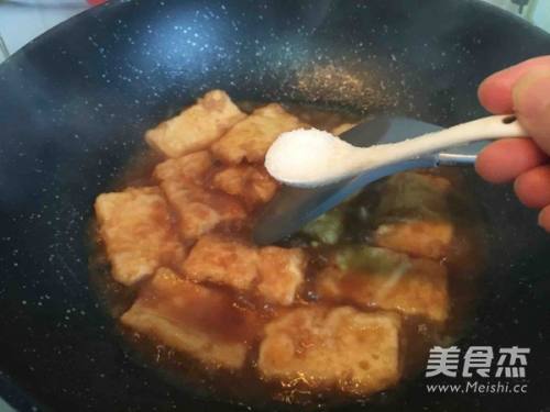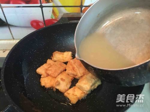 17把豆腐块重新放入锅中加入高汤,我是用了半小盒浓汤宝加水化开的汤