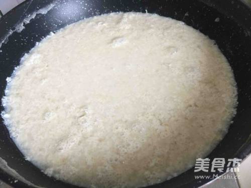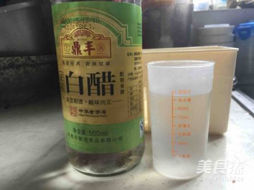 7一点一点加入白醋水,边加边用勺子搅动使它们充分混合,当卤水倒入后不是马上就可以看到变化的,等个2分钟左右,在2分钟之间一定慢慢的搅,一会出现豆花,静置15分钟