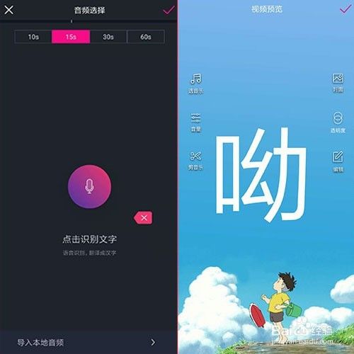文字视频制作入口,你只需要选择好视频时长(15s的入口专门用来做抖音短视频的),选好后直接导入视频或音频,点一下对勾,软件就会智能识别文件当中的音频,生成文字视频,跳转到预览页面。