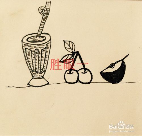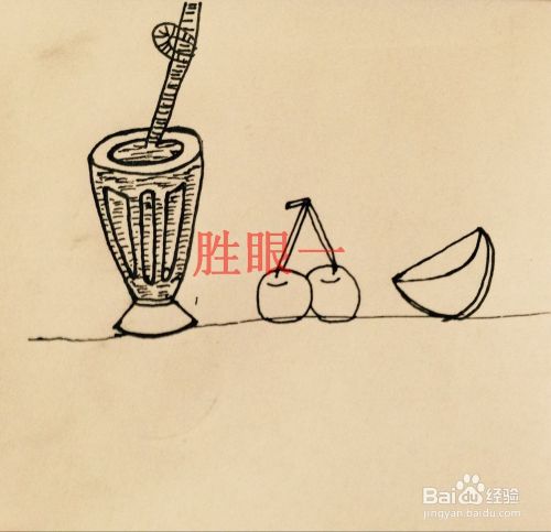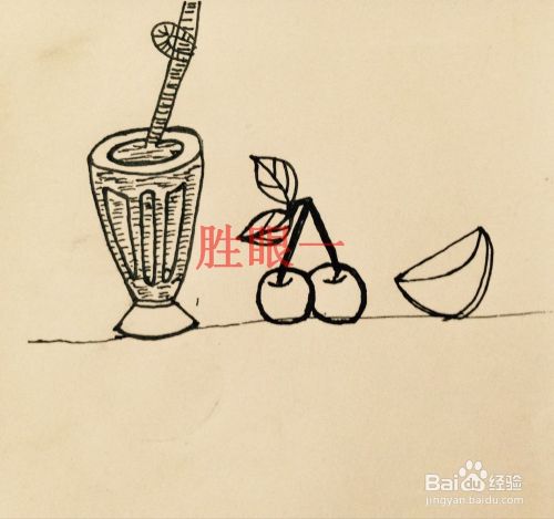 笔者胜眼一今天要画的是果汁杯,果汁,还有一些水果。这里面的水果是樱桃还有切成四分之一的苹果瓣。果汁杯上还有一根吸管,吸管的管口的部分,打了一个很漂亮的结。