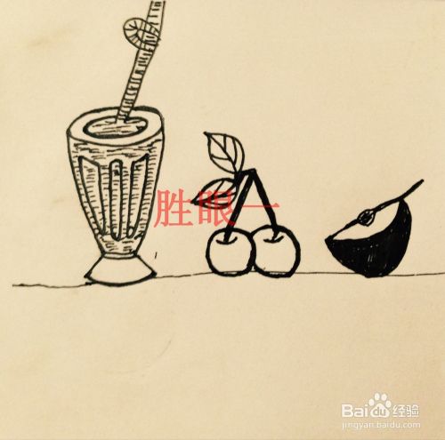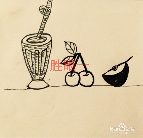 装入果汁的杯子跟吸管就画好了。在旁边再画上水果。我们要画的水果是樱桃和切了一半的苹果瓣。