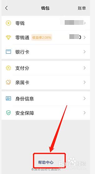 在微信的钱包页面,点击帮助中心。