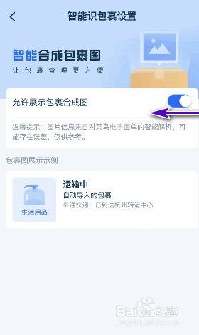 之后将允许展示包裹合成图的滑动按钮向左滑动,滑动完成后便可以关闭允许展示包裹合成图。