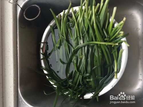 将韭菜用淡盐水浸泡十分钟后,洗净控干。