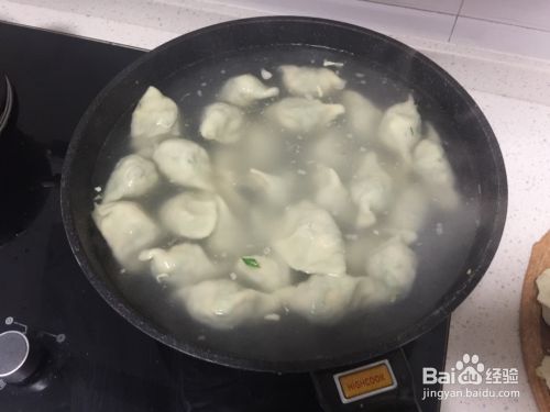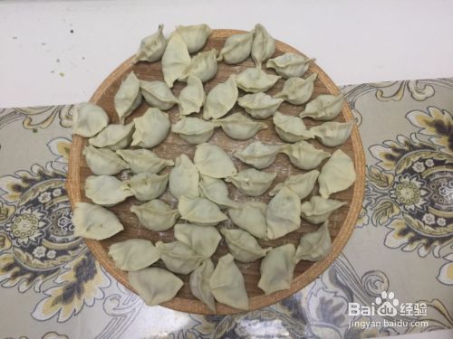 用饺子皮包好,放锅里煮熟,捞到盘中。