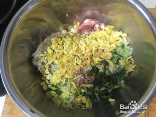 把炒好鸡蛋,切好虾和扇贝,肉馅放到一起,加盐花椒粉,味极鲜酱油,花生油葱,姜沬调伴好。