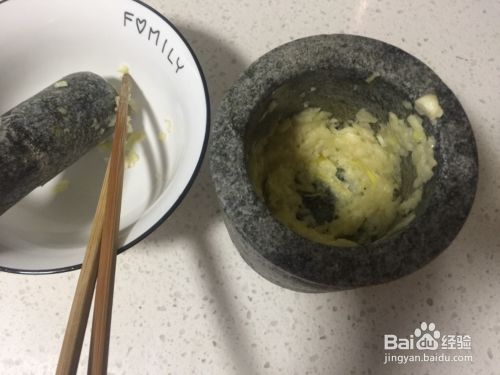 将大蒜捣碎成泥,放入碗中加入醋,味极鲜酱油,占饺子用。