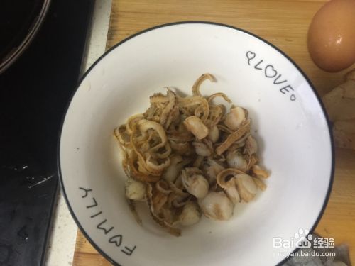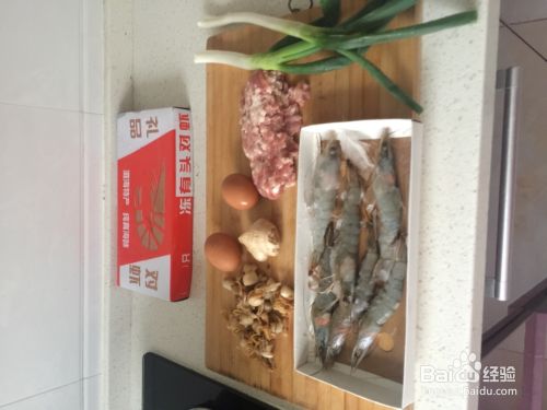 将虾去头,去除腥线洗净,扇贝丁洗净,切碎两种混合一起放一碗中加入料酒盐几分钟再切碎。
