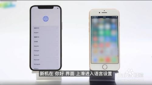 在新机“你好”界面上滑进入语言设置。旧手机出现设置新iPhone提示,点击继续。