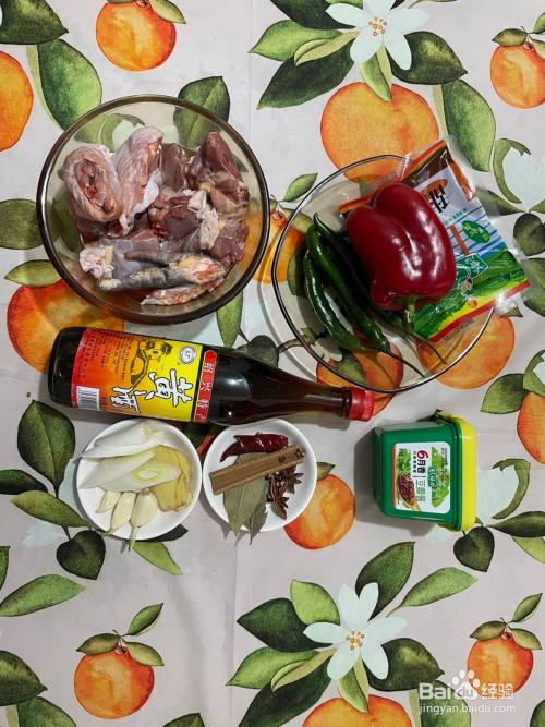 大部分食材拍个全家福。鸡块用清水洗净后用料酒泡上去腥。青椒切段,红椒切滚刀块
