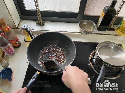 大火爆炒,到水分基本干了,酱恢复浓稠(没必要追求浓稠,觉得差不多就好,炸过了一样会发苦)