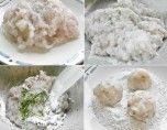 将虾仁以刀背拍扁后先粗剁一下~再仔细的剁成虾泥状(用调理机打亦可)+虾浆调味料拌均匀后..再加入新鲜迷迭香末拌匀即可。取适量虾泥挤出丸子状,沾裹薄薄的一层地瓜粉备用。(裹粉时..手的力道须拿捏好~力量适中..让虾球保持良好的圆形状)