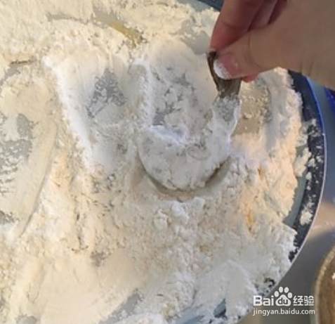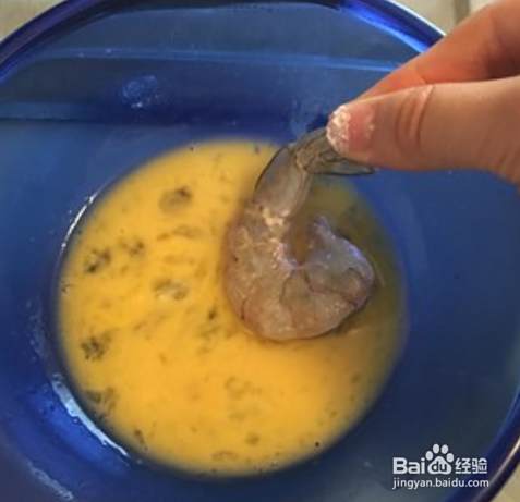一个鸡蛋打散。淀粉与面粉1:1比例配成炸粉。拿住虾尾,先在鸡蛋液里蘸一下。