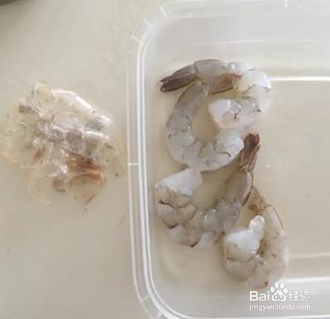 虾解冻好之后,开始剥虾皮。最后一节虾皮和虾尾不要剥,一会儿裹蛋液和炸粉的时候拿着方便,也可以增加香味,丰富口感。