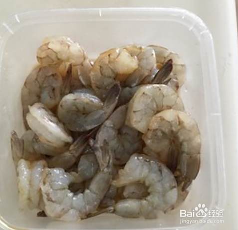 剥好的虾中加入一小勺生抽,一小勺生粉,少量的盐、糖、橄榄油抓匀腌制2小时。