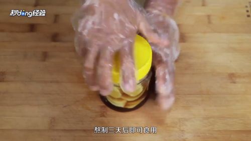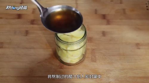 3生姜片腌制好后放入密封罐中,将熬制的醋汁倒入密封罐中,用保鲜膜覆盖罐口盖上盖子。
