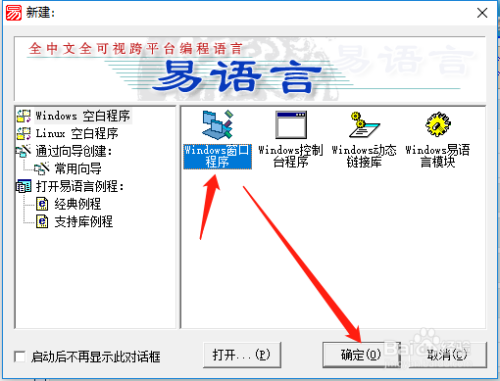 我们启动易语言,打开后选择“Windows窗口程序”新建,然后点击确认,确认后就可以进入到启动窗口的界面了