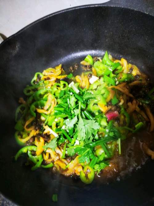 6撒上香菜叶和葱花,加入一勺生抽搅拌均匀,即可出锅。