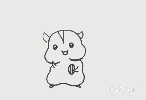 在脸上画出圆圆的眼睛,往下画出嘴巴,然后画出拿着坚果的右手。在身体下画出小小的脚。小仓鼠的形状画出来了。