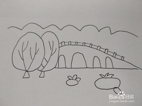 然后在河水里画出一些小植物,在桥的后面用波浪线画出树林,这样OK了。