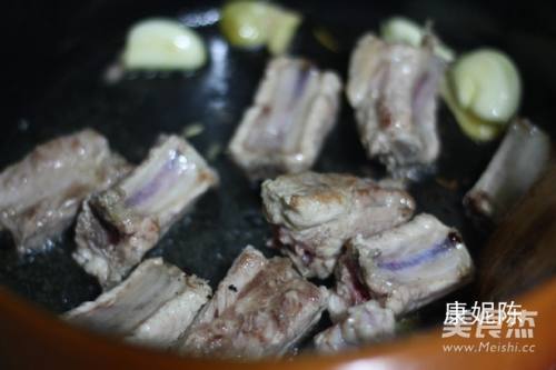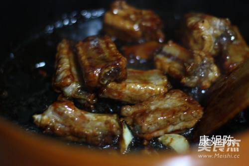 6将调料和排骨炒匀,加入没过排骨的开水,煮沸后转小火,焖煮20分钟