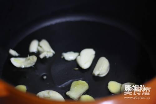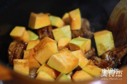 7加入南瓜块,拌匀煮沸后焖煮至南瓜变绵软