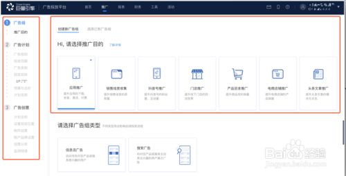 在巨量引擎广告投放平台上,点击“推广管理”,选择“新建广告组”,随后根据您推广的产品或服务类型选择推广目的。推广目的包括应用推广、销售线索收集、抖音号推广、门店推广、商品目录推广、电商店铺推广、头条文章推广。