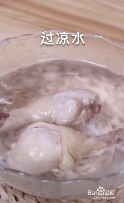 然后将鸡腿放进冷水锅中煮开,煮15分钟左右后捞出。