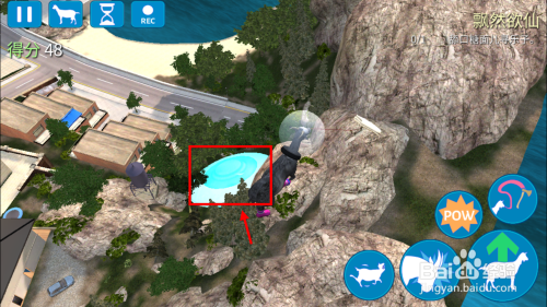 利用反重力山羊,飞起来在地图上寻找池子边上坐着一个人的游泳池。