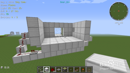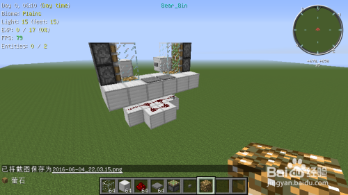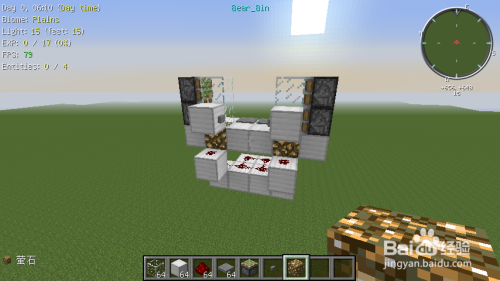 注意:如果你用的“门板”是玻璃,图中两个萤石处要放置透明方块(萤石,上半砖等,玻璃除外),才不会露出下面的电路,影响视觉效果。如果这里放了实心方块,会导致门外按钮失效。