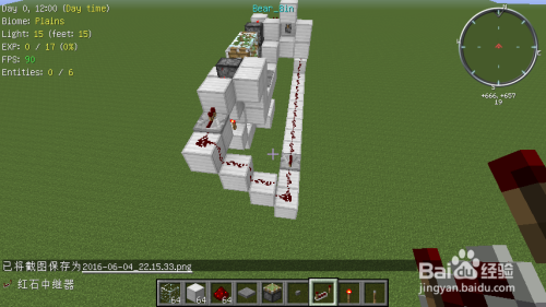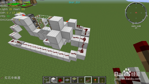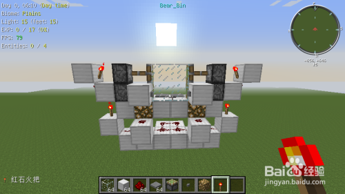 同时连两条线路,激活下面两个活塞,以在上面两个方块打开时锁住下面两个方块,,这里也可以利用红石火把从下方激活,用来扩大室内空间,具体此处不一一演示。