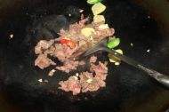 主料牛肉400g<br>配料油适量<br>盐适量<br>茶树菇200g<br>青椒1只<br>蒜头适量<br>姜片适量<br>红椒1只<br>葱适量<br>耗时 准备时间10分钟内<br>制作时间10分钟内