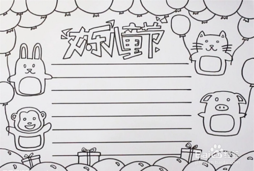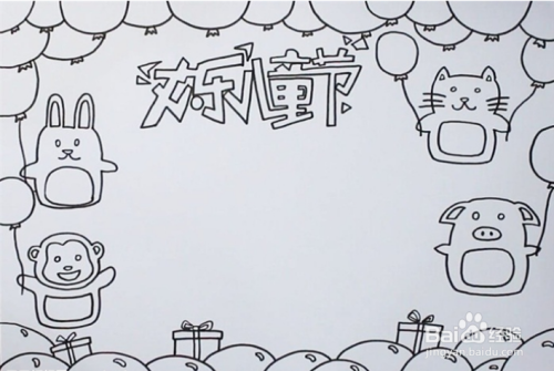 接着我们在手抄报的左右两侧画上几个小动物,左侧画上一个小兔子和小猴子,右侧画上小猫和小猪,它们的手里拿着气球。