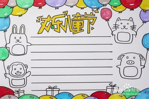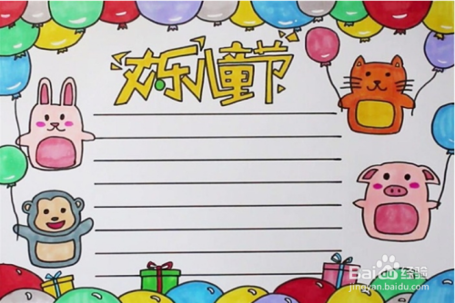 最后,我们给小兔子和小猪涂粉色,小猴子涂深灰色,小猫咪涂橘黄色,可爱的六一儿童节手抄报就完成啦!