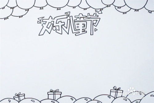 首先我们在手抄报的顶部和底部画上一排气球,一个个的气球紧紧的挨在一起,底部再画上两个礼物盒,在手抄报中间写出主题。
