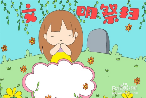 接下来先给报头文字涂上红色,再给小女孩上色,云朵边框涂上粉色,草丛和草坪以及柳叶、小草涂上深浅不同的绿色,墓碑涂上灰黑色,菊花涂黄色,小花朵涂上橙色和黄色,背景涂上浅蓝色。