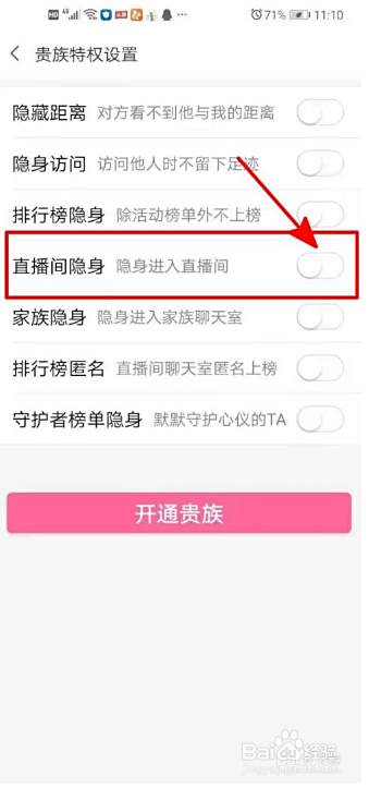 进入贵族特权设置界面后,点击页面中直播间隐身后的圆圈,完成设置。